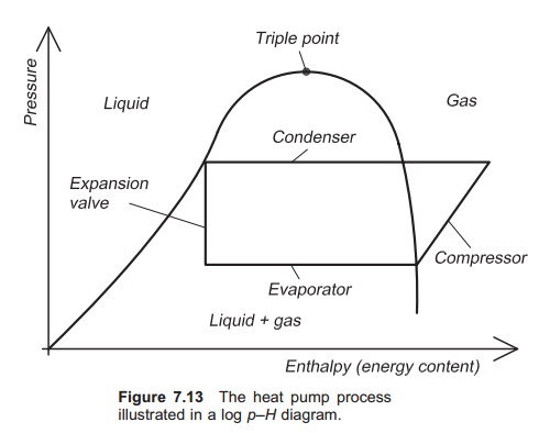 Here's the phase change and pressure diagram. To heat your home, the heat pump moves around the trapezoid in a counter-clockwise motion. via BrainKart