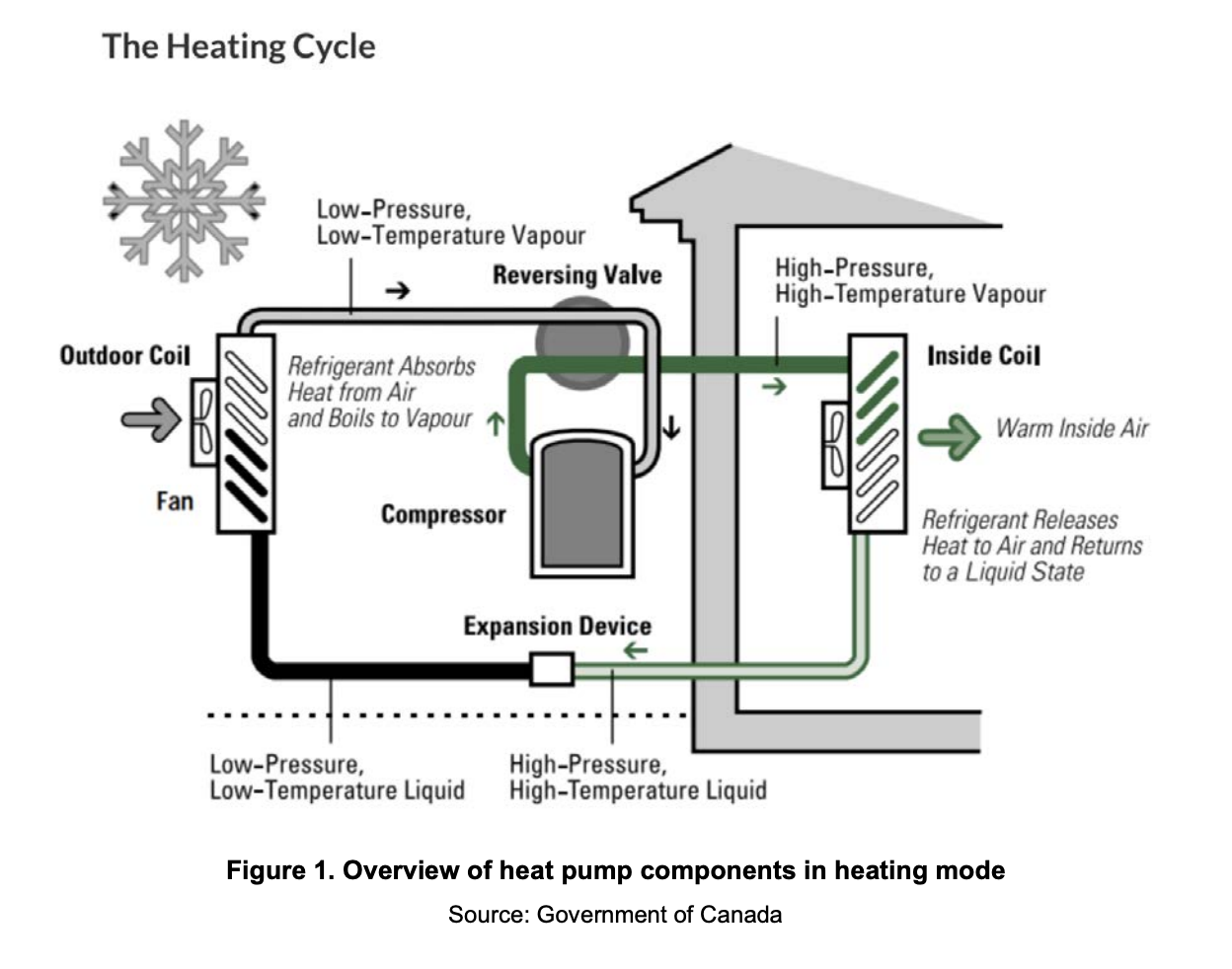 Here's the heat pump heating cycle. All the components are working together to move heat inside the house. via NREL